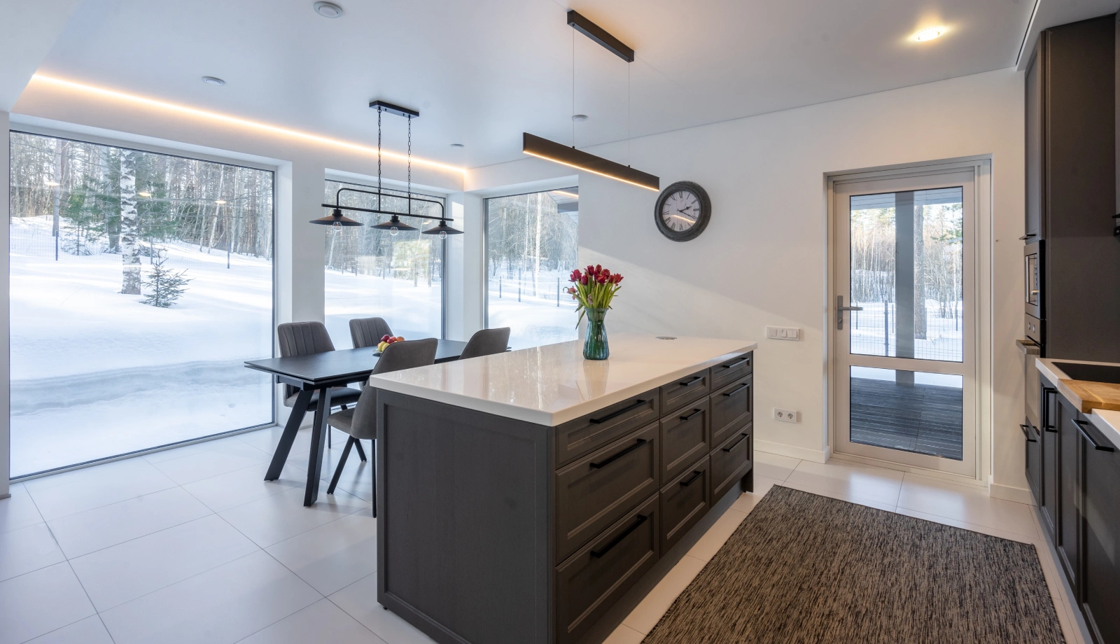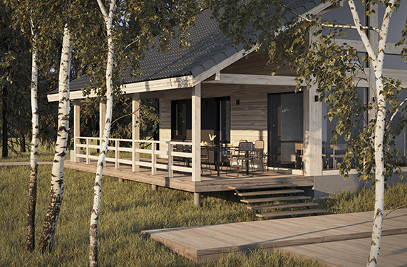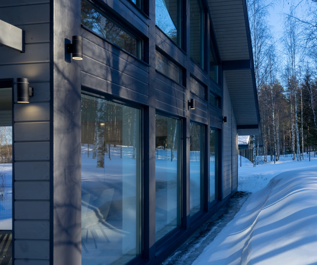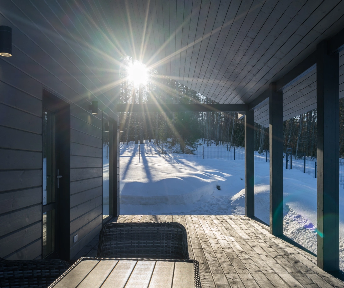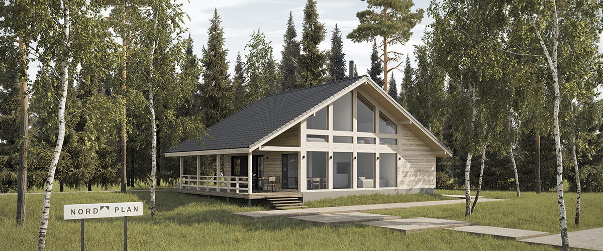 В доме "NORD-150" большая кухня-столовая с островом, обеденная зона в ней обрамлена панорамными окнами со стеклянным углом. Все помещения двухэтажного дома, площадь которого 150 квадратных метров, очень просторные. Шаг лестничного марша, ведущего на второй этаж, пологий и удобный для детей и пожилых людей. В доме предусмотрены двухуровневая гардеробная (высота потолка до 4 метров) и хозяйственный блок для спортивного инвентаря с отдельным выходом на большую террасу. Терраса раположена практически по периметру дома.Часть её, предназначенная для летних обедов на улице, крытая.