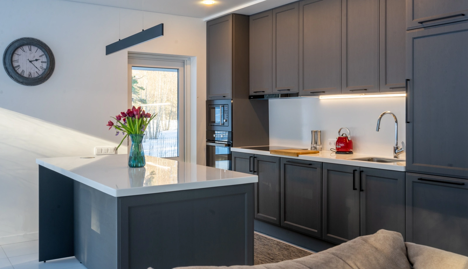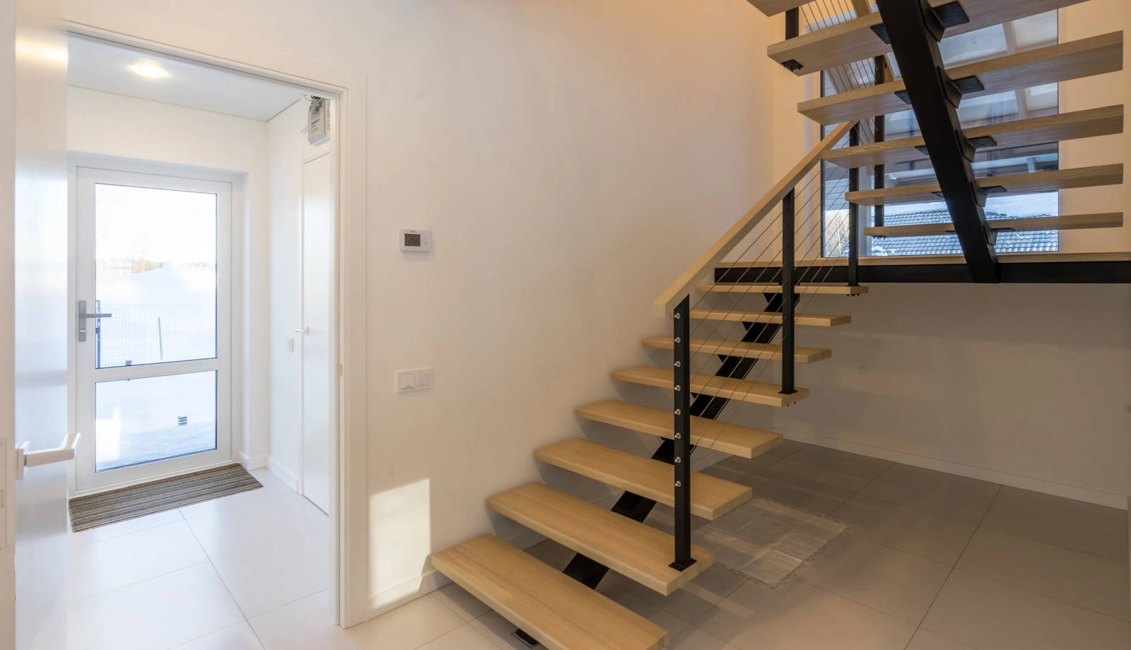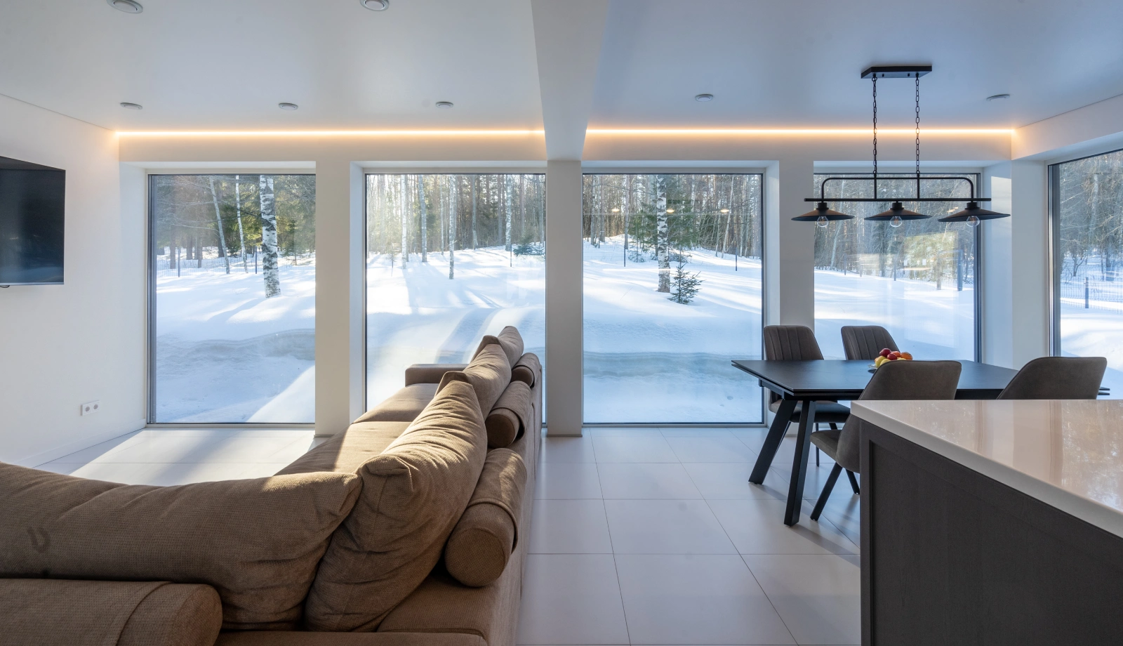 В доме "NORD-150" большая кухня-столовая с островом, обеденная зона в ней обрамлена панорамными окнами со стеклянным углом. Все помещения двухэтажного дома, площадь которого 150 квадратных метров, очень просторные. Шаг лестничного марша, ведущего на второй этаж, пологий и удобный для детей и пожилых людей. В доме предусмотрены двухуровневая гардеробная (высота потолка до 4 метров) и хозяйственный блок для спортивного инвентаря с отдельным выходом на большую террасу. Терраса раположена практически по периметру дома.Часть её, предназначенная для летних обедов на улице, крытая.